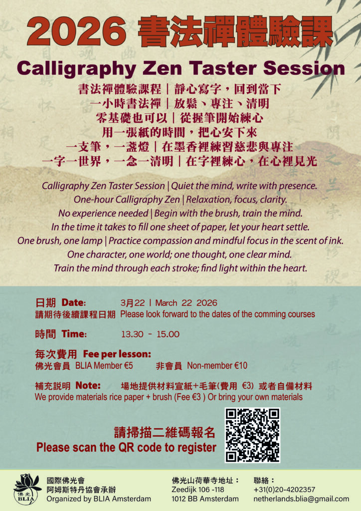 Welcome to He Hua Temple for a special Calligraphy Zen Experience, a peaceful practice of mindfulness through writing. No calligraphy experience is needed. Beginners are warmly welcome. Entree: 10 euro