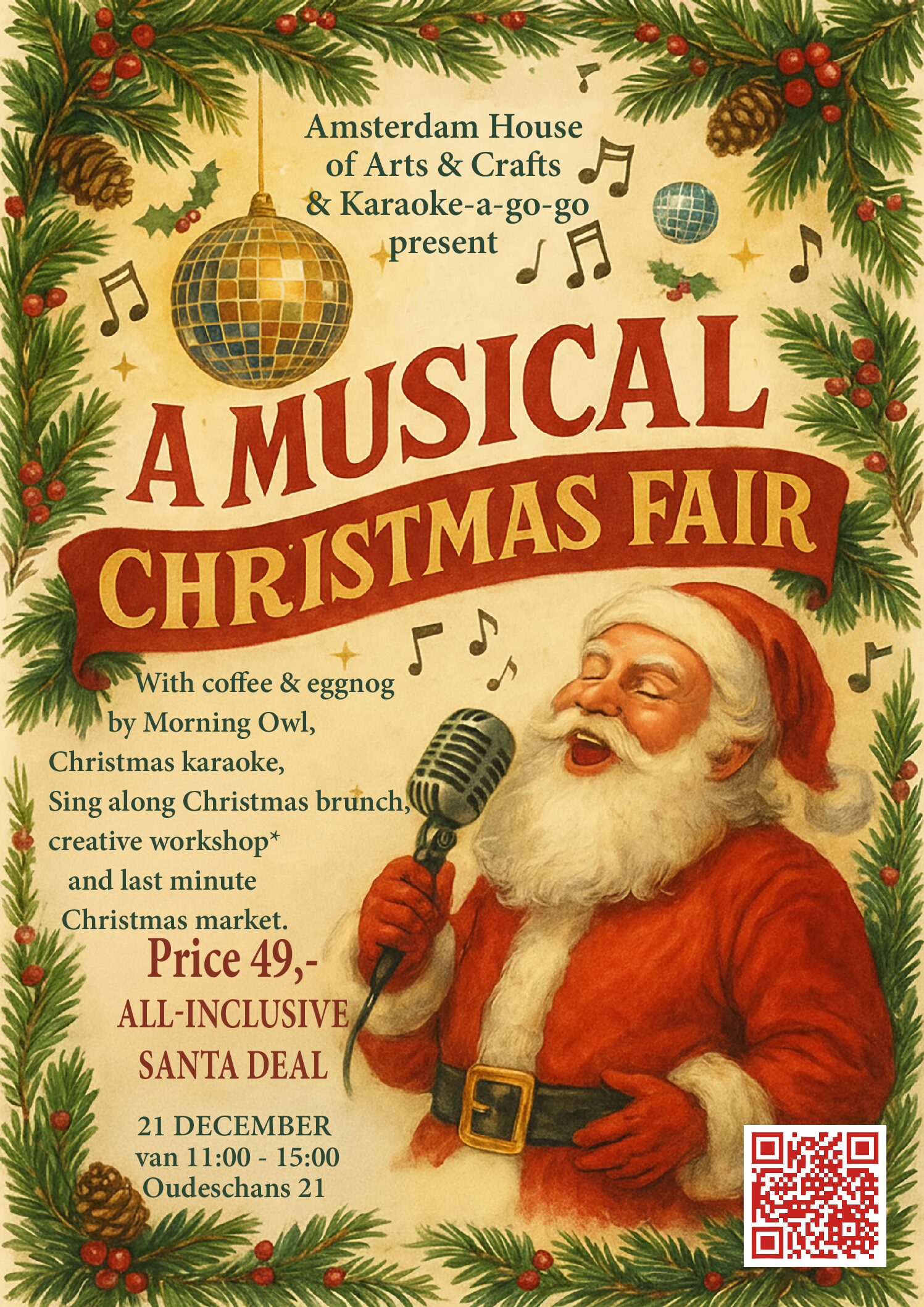 Kerst Create & Celebrate – Sing-Along Brunch & Markt Vier de kortste dag van het jaar bij het Amsterdam House of Arts & Crafts met een hartverwarmende, muzikale kerstmiddag. Dit vier uur durende evenement brengt een kerstbrunch, creatieve mini-workshops, kerstkaraoke en een last-minute kerstmarkt samen — allemaal inbegrepen in één ticket. Inclusief – All-Inclusive Kerst Deal (€49): Kerstbrunch (buffet met warme en koude gerechten) Koffie en advocaat van Morning Owl Kerstkaraoke door Karaoke-a-go-go Creatieve workshop naar keuze:* Maak je eigen kerstkaars Mozaïek onderzetter Glazuur je eigen kerstmok Toegang tot de last-minute kerstmarkt Workshops zijn geschikt voor beginners; iedereen kan meedoen. Samen eten, zingen, creëren en genieten — allemaal onder één dak. We hebben 50 kaarten beschikbaar, dus wees er op tijd bij.