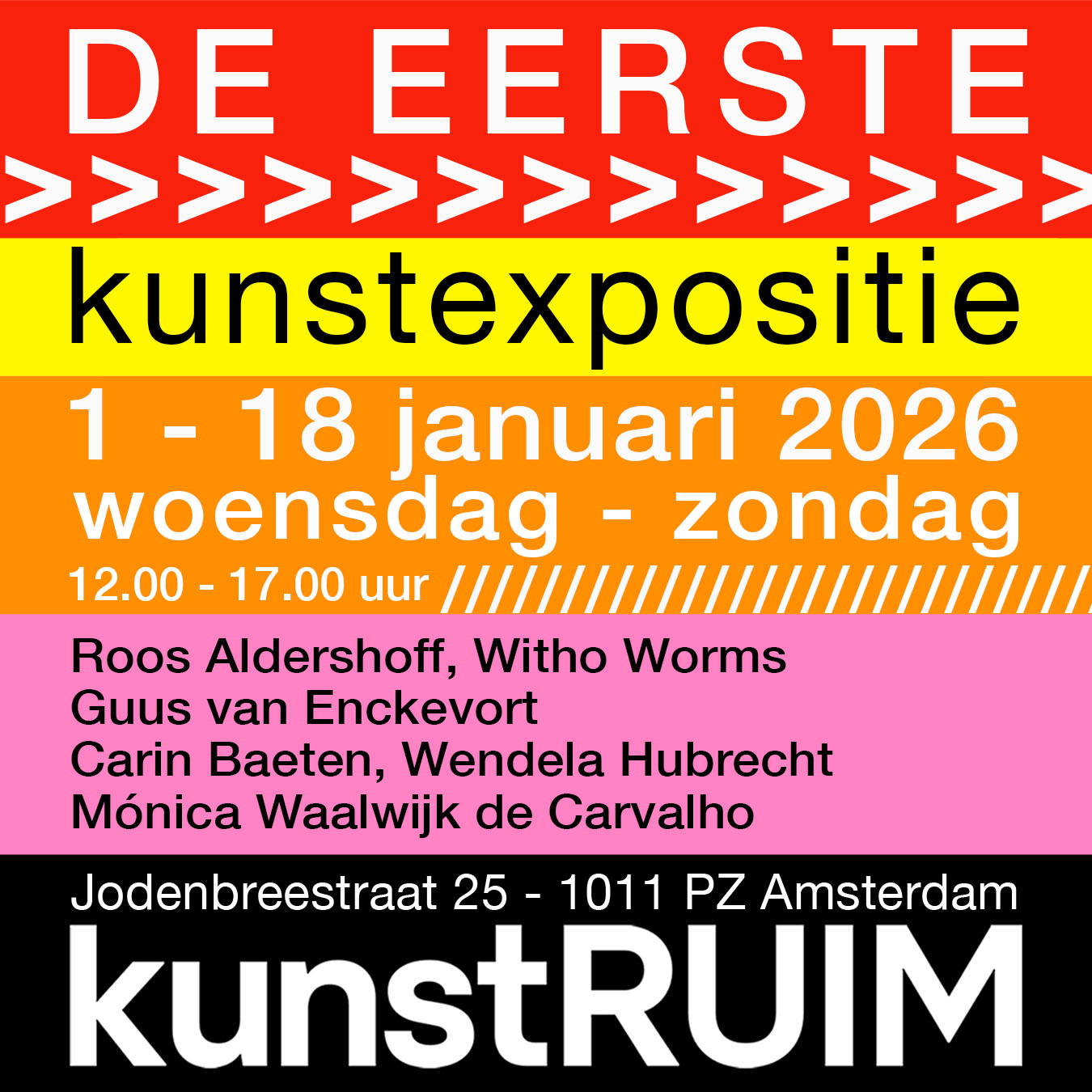 Op nieuwjaarsdag opent DE EERSTE: zes kunstenaars, één gezamenlijke expositie met gevarieerd werk: fotografie, textielkunst, schilderijen en installaties komen samen. Een eerste dosis kunst in het nieuwe jaar. Meer info via: https://kunstruim.amsterdam/events/intern/de-eerste