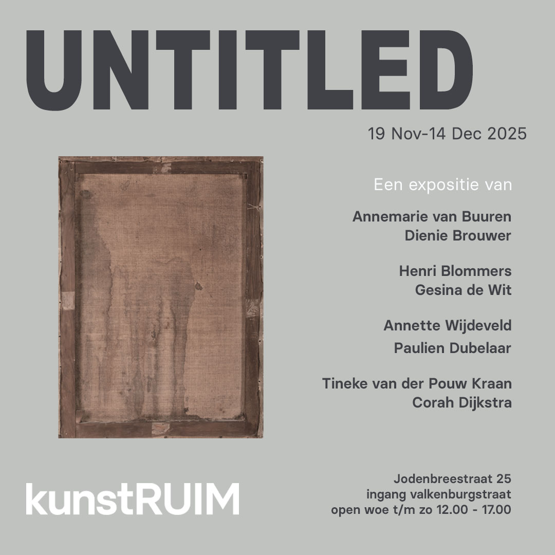 Fotografencollectief Untitled presenteert hun eerste gezamenlijke expositie. De leden van fotografencollectief Untitled leerden elkaar kennen tijdens de deelname aan toonaangevende kunstbeurzen. Geïnspireerd door hun gezamenlijke liefde voor vakmanschap en experiment besloten ze hun krachten te bundelen en zelf exposities te organiseren waarin ambachtelijk werken en artistieke vrijheid centraal staan. Ieder van hen brengt een eigen signatuur en techniek mee – van historische drukprocedés tot innovatieve experimentele methoden. Samen vormt dit een een rijk en veelzijdig geheel. Voor hun eerste gezamenlijke expositie kozen ze, niet toevallig, voor kunstRUIM, een karaktervol anti-kraakpand, dat perfect past bij hun onafhankelijke en vernieuwende spirit. Fotografen: Dienie Brouwer, Henri Blommers, Gesina de Wit, Annette Wijdeveld, Paulien Dubelaar, Tineke van der Pouw Kraan, Corah Dijkstra & Annemarie van Buuren Feestelijke opening: zaterdag 22 november 16.00- 18.00